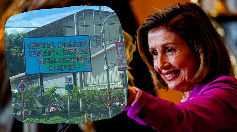 ▲裴洛西訪台之際,南投竹山鎮公所戶外廣告看板被駭!(圖/翻攝自批踢踢、裴洛西推特)