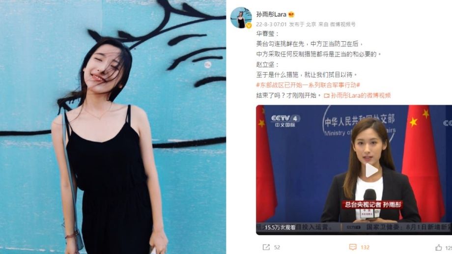 擁有空靈大眼、甜美笑容的央視正妹主播孫雨彤今上午在微博上傳一段新聞報導短片,影片先是播放,中國外交部發言人華春瑩日前針對裴洛西訪台一事發表的聲明,「美台勾結挑釁在先,中方正當防衛在後,面對美方罔顧中方反覆嚴正交涉,恣意妄為,中方採取任何反制措施都將是正當的和必要的。」華春瑩強調,更何況中國擁有5千年歷史與14億人口的堅定意志,希望美方對此有清醒的認知。