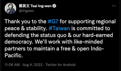 對此,蔡英文特別在4日透過推特感謝「七大工業國組織」(G7)支持區域的和平及穩定。她強調,台灣致力捍衛現狀和得來不易的民主,將與理念相近的夥伴們一起維護印太地區的自由開放。