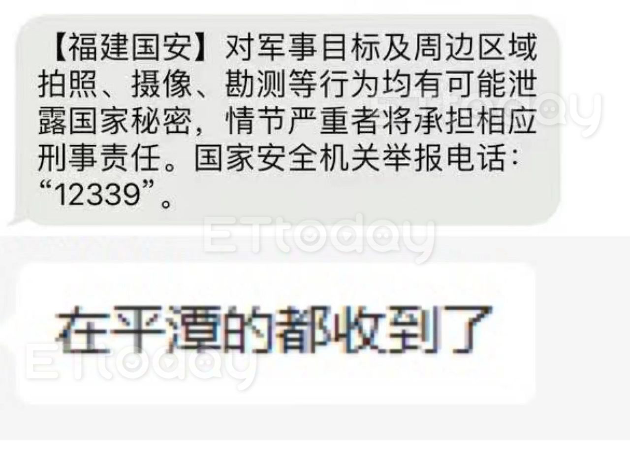 他也向記者提供「福建國安局」多封簡訊,內文寫「對軍事目標及周邊區域拍照、攝像、勘測等行為均有可能洩露國家秘密,情節嚴重者將承擔相應刑事責任。國家安全機關舉報電話12399。」