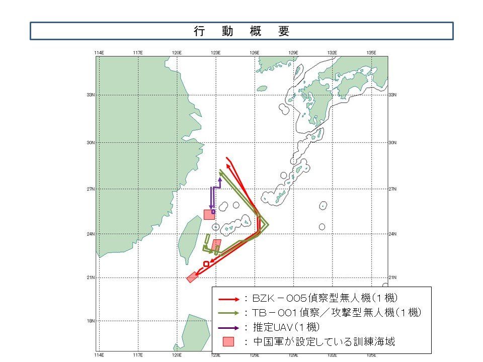 BZK-005從日本沖繩、宮古島水域穿越至台灣東南方海域的軍演水域後原路折返;TB-001同樣穿越沖繩與宮古島間水域,飛抵台灣東部海域軍演後返航;另1架未知的無人飛行器則在前述2架無人機出發地點徘徊飛行。