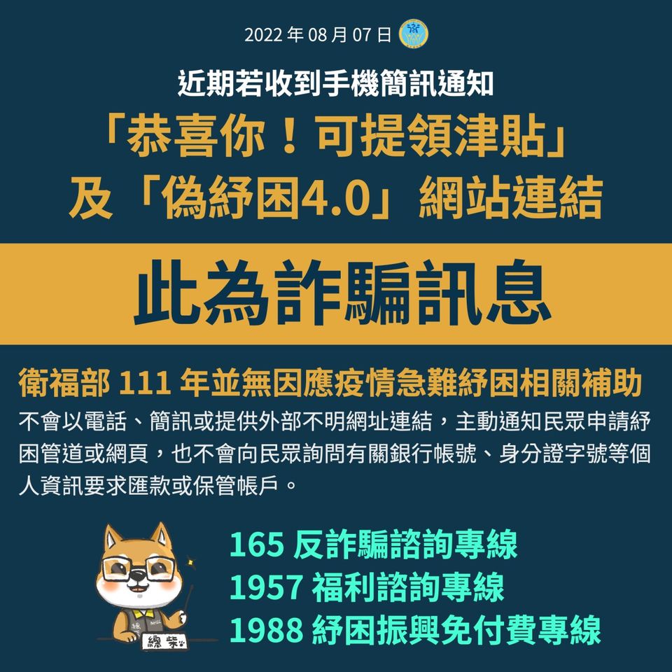 衛福部社會救助及社工司司長蘇昭如表示,近日接獲民眾反應收到假冒「衛生福利部」詐騙網站、4.0紓困補助簡訊,還有自稱本部紓困專案人員匯款予民眾,但「因應疫情擴大急難紓困實施計畫」已於110年6月30日截止,現無與疫情相關紓困措施或計畫。