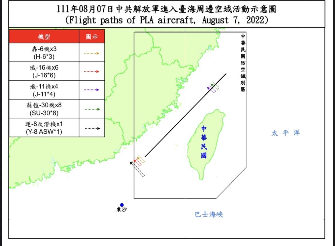 共軍4日開始在台灣周邊的海域、空域進行軍演,台海緊張情勢上升。國防部7日晚間表示,7日共有66架次共機擾台、14艘共艦擾台,其中22架跨越海峽中線。我國空軍派遣空中巡邏兵力應對,並以空中偵巡兵力、海軍艦艇,以及岸置飛彈適切應處。