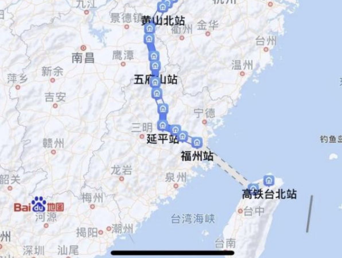 報導稱,不僅如此,搜索「北京-台北」路線,可看到路線規劃中包含「京台高鐵」。百度地圖提示稱,「兩岸未來通行路線-台海大橋(已規劃),當前路線僅供查看」。