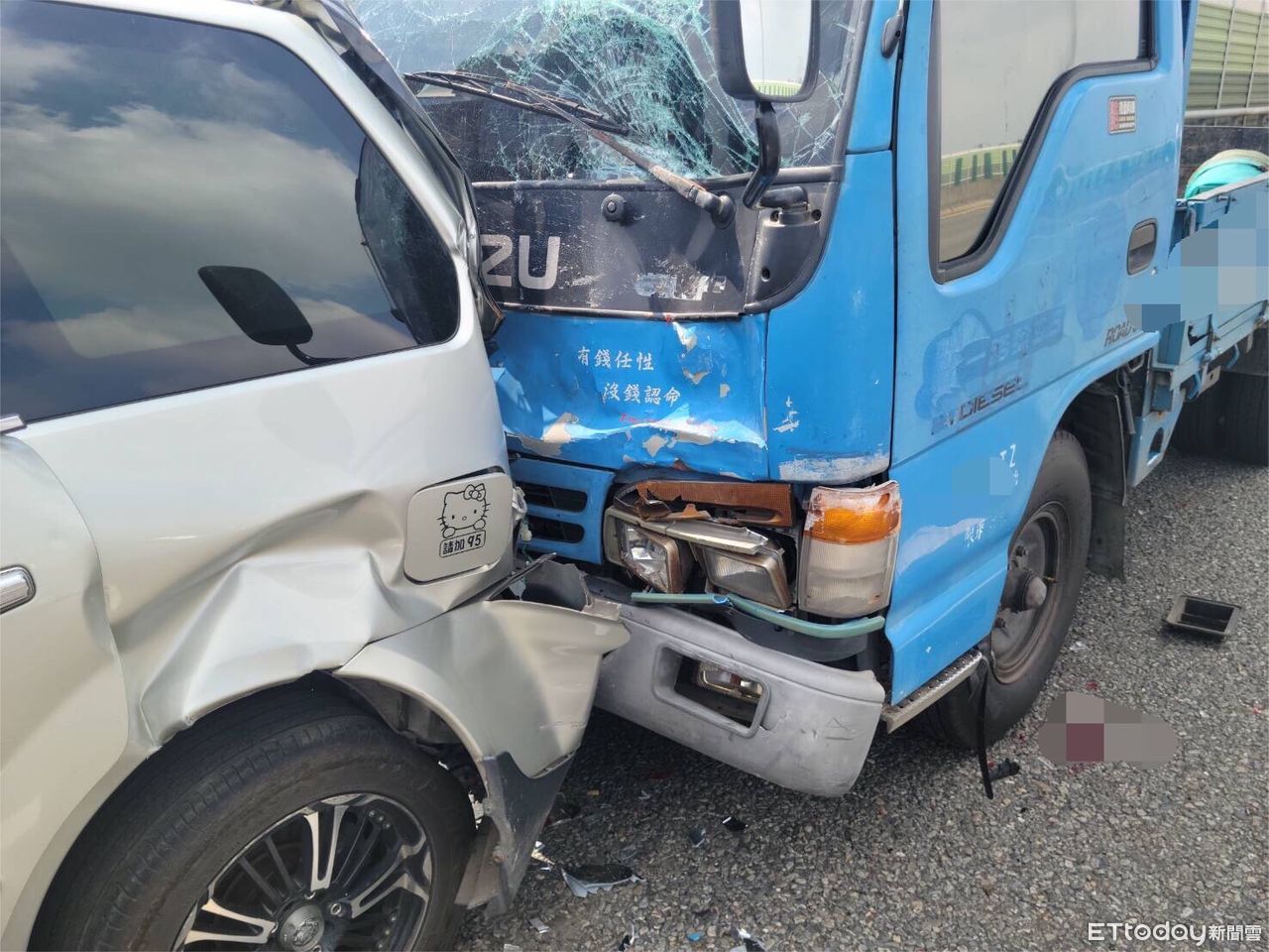 第五分局警方表示,黎男疑似未注意車前狀況,導致撞上排隊下交流道的銀色自小客車,再追撞上前方一台黑車與2輛小貨車,小貨車擋風玻璃碎裂,銀車則車尾嚴重凹陷,車頭再撞上前車也嚴重損毀,其中銀車後座的有病史的李男傷勢較為嚴重,當場失去生命跡象。
