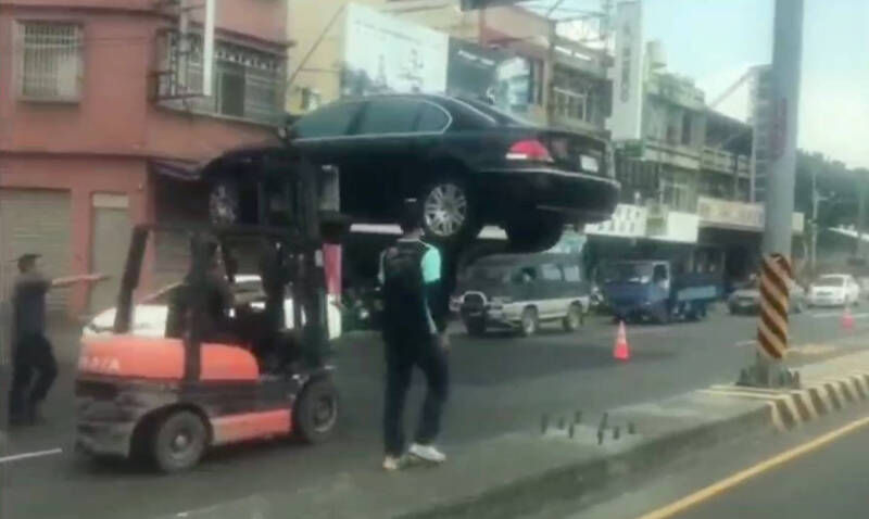 只見堆高機牙叉伸入大7汽車底盤內,再騰空舉起,一旁還有多名民眾及路人協助指揮,車體毫髮無傷的移動到對面路旁空地上,只見車流緩緩疏通,車主也能安心等待拖吊車。