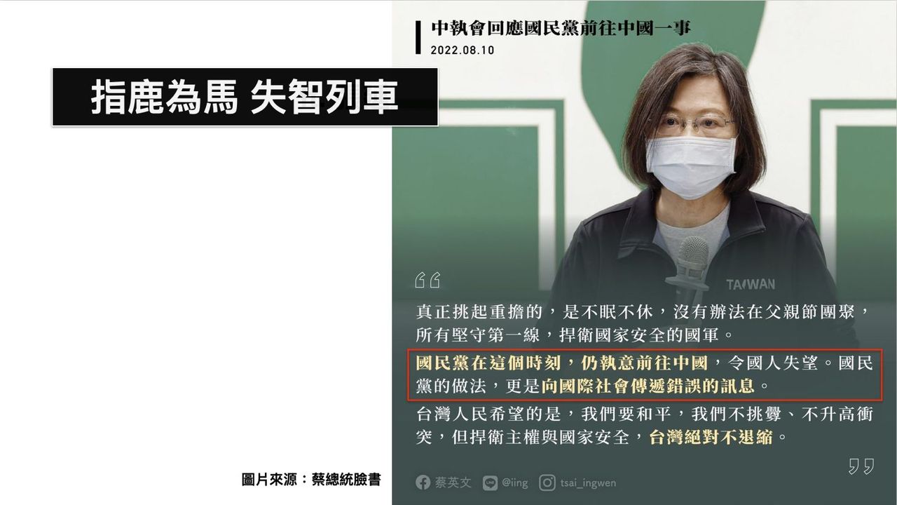黃暐瀚痛批,蔡英文除了指鹿為馬、硬拗之外,還要看看「誰敢跟我唱反調?」他舉例,當年秦二世胡亥無能,趙高專橫,他在殿上公然指鹿為馬,除了是要展現自己的權威之外,也是要看看,還有誰敢違逆?少數幾位直言不諱的忠臣,若不肯指鹿為馬,下場都是斬殺。