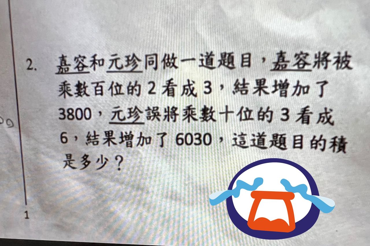 一位媽媽在臉書「Gangs of Tian Mu 天母幫」貼文,「求救高手幫忙數學解題,小五數學,請問這題要怎麼講解給小孩理解?」只見問題是「嘉容和元珍同做一道題目,嘉容將被乘數百位的2看成了3,結果增加了3800。元珍誤將乘數十位的3看成了6,結果增加了6030,這道題目的『積』是多少?」