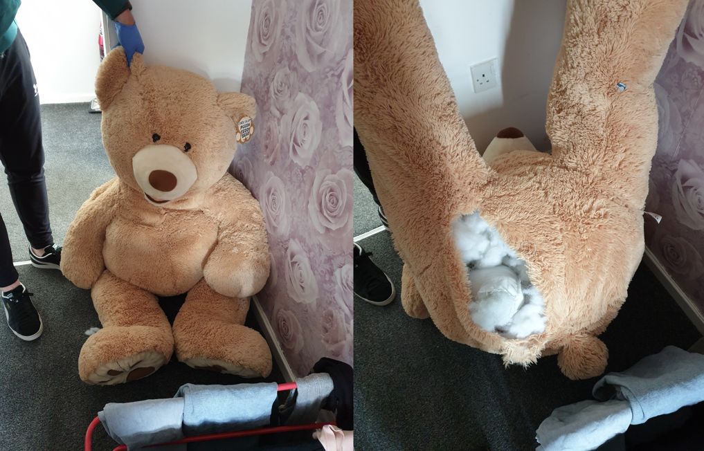 從照片中可看到,熊娃娃的屁股處破了一個大洞,裡面還充填了許多棉花,沒想到多布森竟然可以整個人塞進裡面,誇張畫面在網路上瘋傳。警方表示,員警當時注意到熊娃娃居然在「呼吸」,看了幾眼後決定仔細搜查,結果在裡面找到躲藏的多布森,最後將他判刑9個月,目前人已經被關在監獄中。