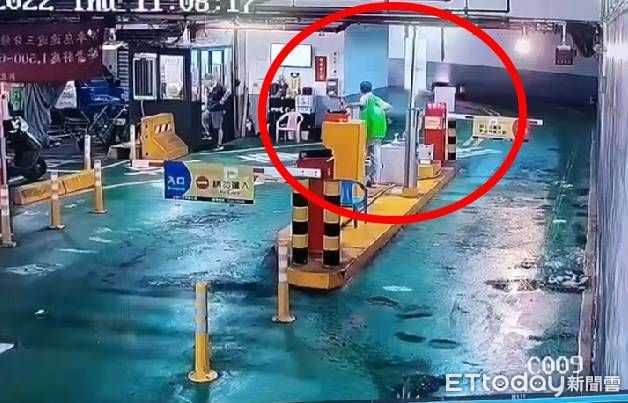 ▲女騎士因地上泡泡噴飛,門牙碎裂,停車場管理員第一時間嚇傻 。(圖/記者戴上容翻攝)