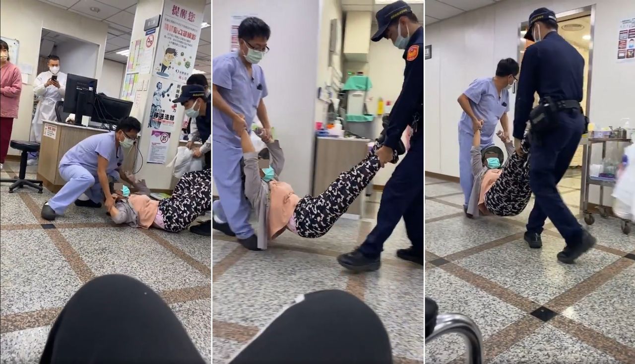 ▲一名婦人在醫院情緒失控,遭醫護人員和警方抬走。(圖/翻攝自Facebook/爆廢公社)