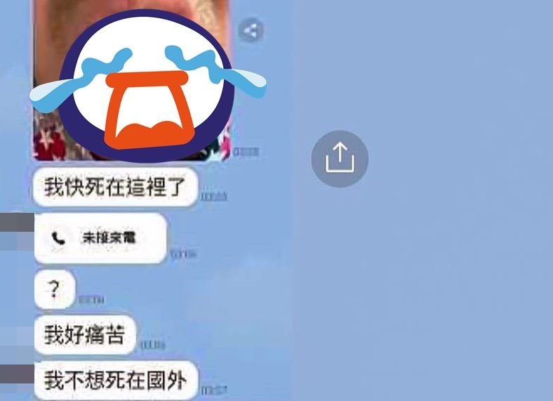 她貼出多張當地的照片,其中一張是友人傳來的求救訊息,傳送一張舌頭被割掉的照片,並痛苦喊「我快死在這裡」、「我好痛苦」、「我不想死在國外」。