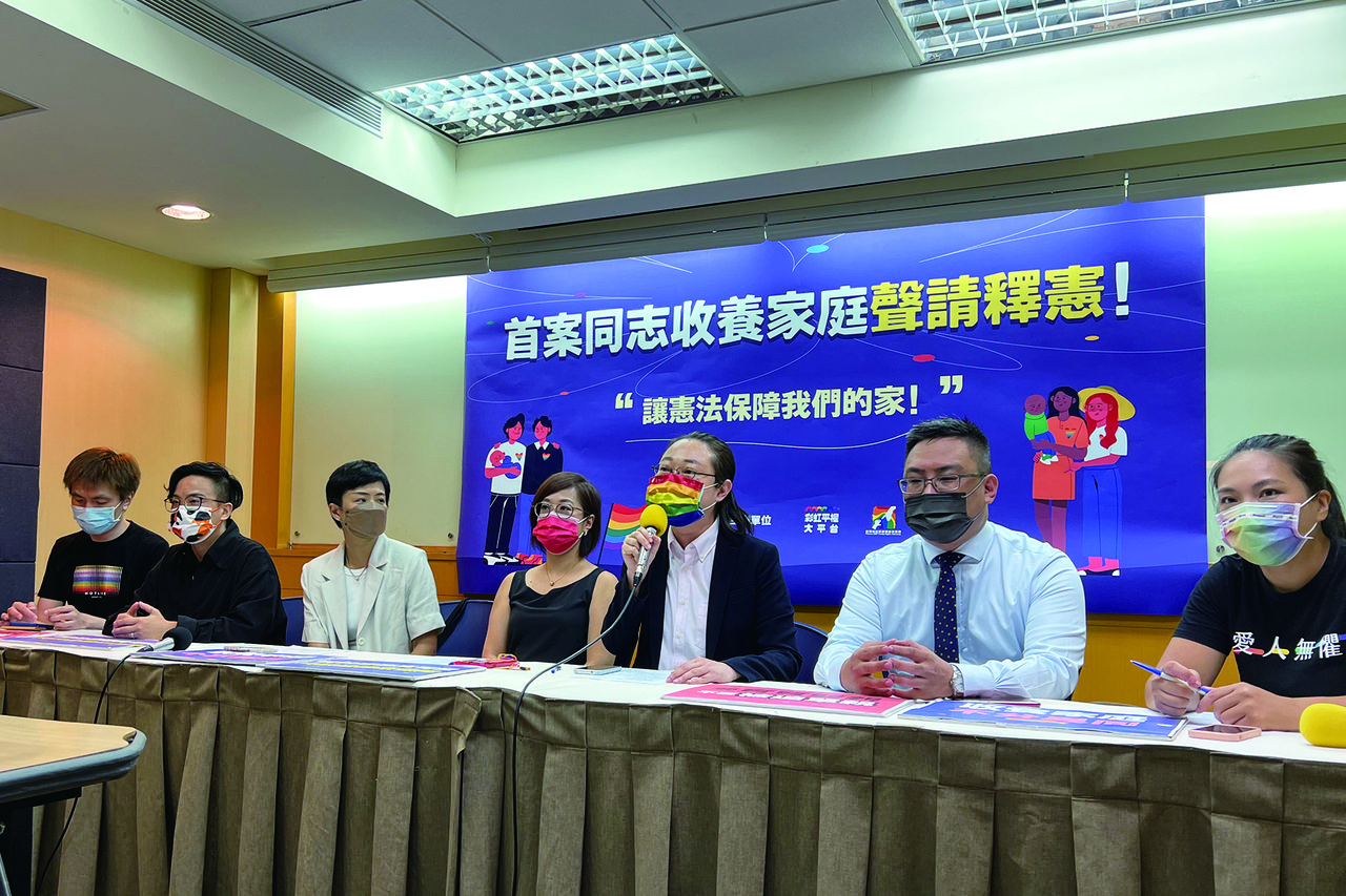 ▲台灣首案同志收養家庭聲請釋憲,彩虹平權大平台、同志家庭權益促進會、同志諮詢熱線召開聯合記者會。(圖/彩虹平權大平台)