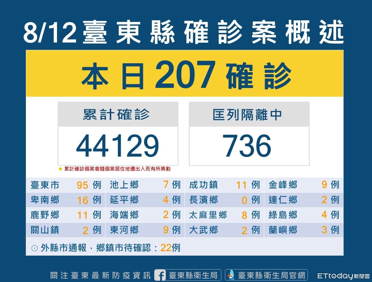 台東縣12日新增207位確診者,185名民眾戶籍或居住地分在台東、22名為外縣市醫院通報。目前台東縣累計確診個案44129人、居隔者736人。目前台東針對COVID-19確診者分流收治情況,截至8/11下午16點為止,住院收治人數為24、加強版集中檢疫所為29人、居家照護現管人數有1276人。