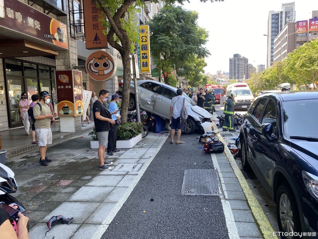 ▲汽車突然撞上路邊機車騎士,在波及人行道2台機車,最後騎士仍宣告不治。(圖/記者邱中岳翻攝)