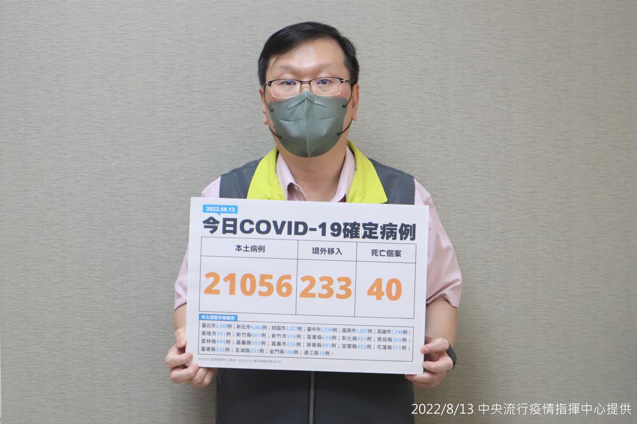 指揮中心指出,今日新增40例本土病例死亡個案,為27例男性、13例女性,年齡介於30多歲至90多歲以上,皆屬重度感染且具慢性病史、30例未接種3劑COVID-19疫苗。確診日介於今(2022)年5月2日至8月10日,死亡日期介於5月10日至8月10日。