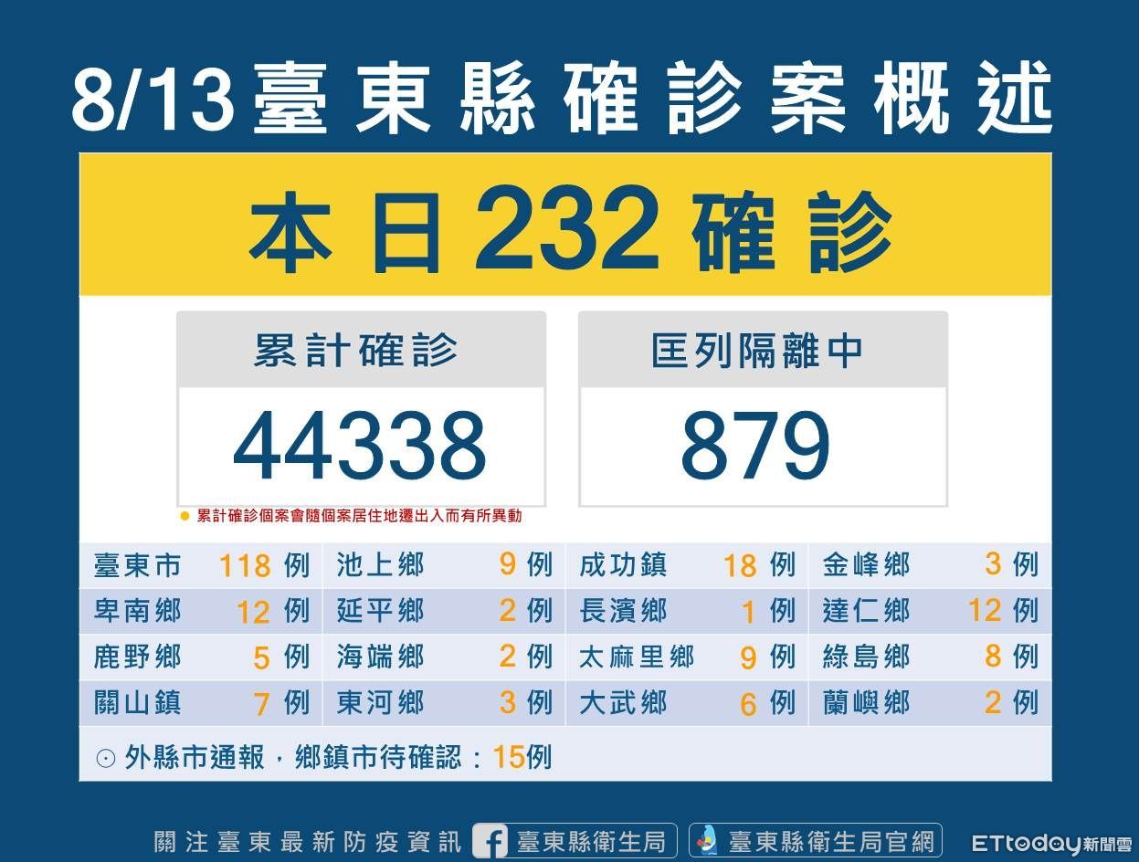台東縣13日新增232位確診者,217名民眾戶籍或居住地分在台東、15名為外縣市醫院通報。目前台東縣累計確診個案44338人、居隔者879人。目前台東針對COVID-19確診者分流收治情況,截至8/12下午16點為止,住院收治人數為26、加強版集中檢疫所為30人、居家照護現管人數有1294人。
