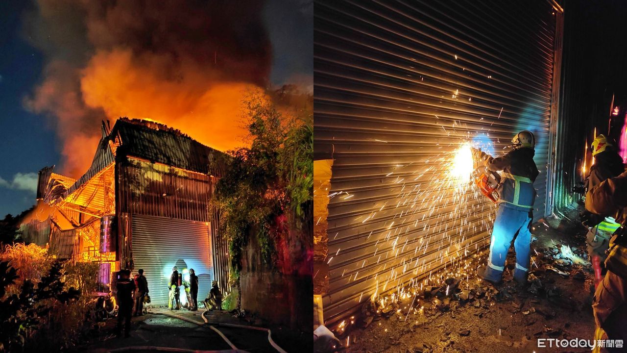 ▲基隆花圈籃工廠起火燃燒,消防人員全力急灌救。(圖/記者郭世賢翻攝,下同)