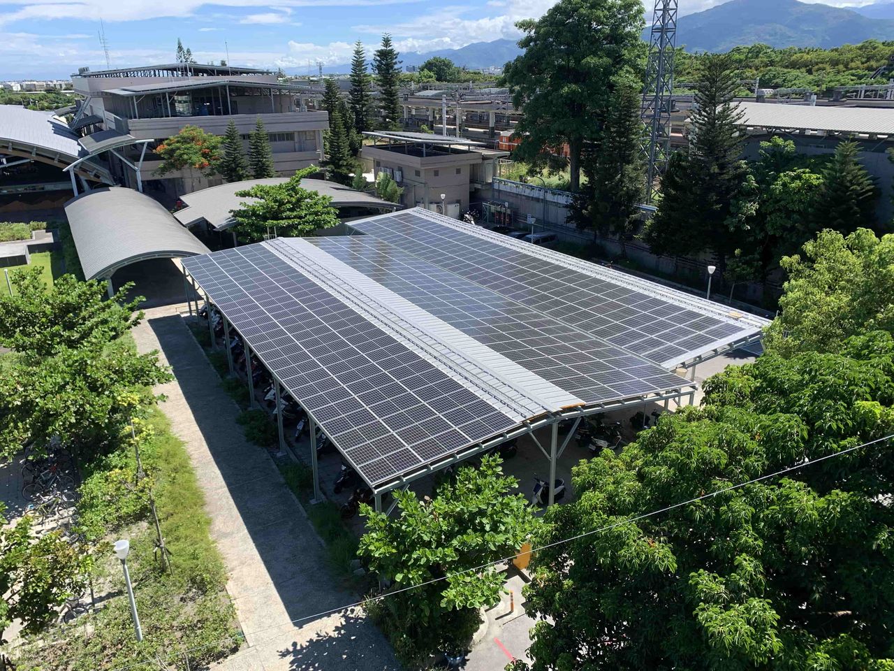 交通部台鐵局資產開發中心花蓮營業所針對臺東站區建物屋頂、露天人行道及停車場(含自行車、機車),及計程車排班區規劃設置太陽光電棚架,為全國首座「被太陽光電板守護的綠電車站」,每年可減少的碳排量相當於2座大安森林公園,一年回饋金可達87萬。