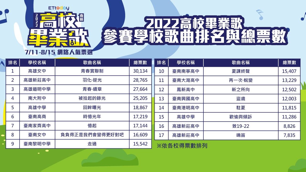 《ETtoday新聞雲》主辦的「2022高校畢業歌」網路人氣票選結果出爐啦!今年有14所學校、共17首畢業歌作品參賽,最終第一名由霸榜數周的高雄女中《青春實聯制》奪冠,高雄新莊高中《羽化.逆光》位居第二,高雄道明中學《青春.續章》則名列第三,恭喜今年得獎者。