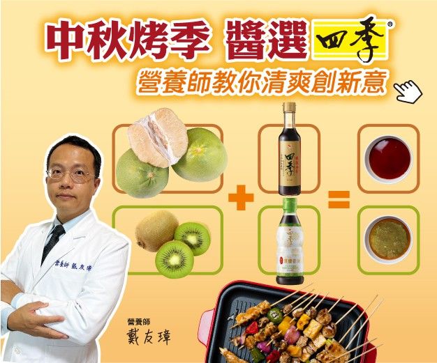 誰說想要盡情享受烤肉的樂趣,就必須犧牲掉飲食健康?戴友璋營養師這次特別選擇了解國人飲食趨勢的台灣本土品牌「四季」,以旗下深受外食族歡迎的「四季釀造薄鹽醬油」和經典的「四季釀造油膏」,各別調製出2種「清爽系烤肉醬」!目前在台灣幾乎一整年都買得到的奇異果,由於含有豐富的營養成分,是不少健身族群和女性喜愛的水果之一。奇異果獨特的酸香,配上清爽回甘的薄鹽醬油,讓「奇異果烤肉醬」意外適合搭配蛤蠣、蝦子、小卷等滋美味豐的海味,提引出這些食材的鮮甜!中秋節期間,隨手可得的柚子也很適合入醬,這款「柚香烤肉醬」可以簡單淋少許在生菜沙拉上,吸引肉食族吃進更多蔬菜,還可以刷在肉感較重的牛、豬、羊等肉串上,幫忙解膩同時提升口感。