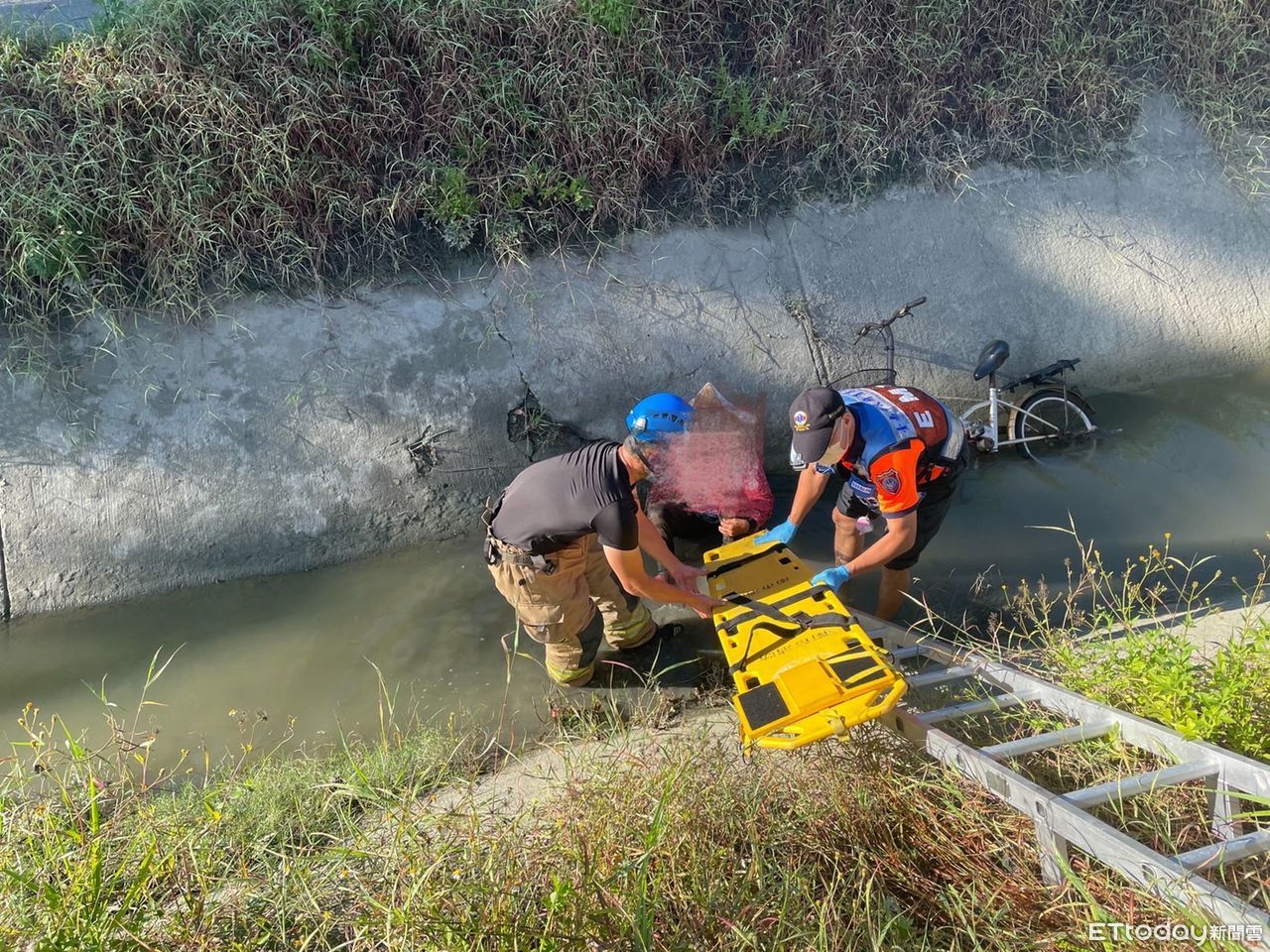 ▲1名80多歲婦人,16日上午騎單車行經台南市安南區郡安路時,疑一時不慎連人帶車跌落路旁圳溝內,消防人員搶救脫困送醫。(圖/民眾提供,下同)