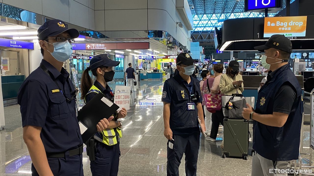 ▲桃園機場東南亞的聯合報到櫃檯人潮爆滿,警方舉牌提醒民眾嚴防詐騙。 (圖/記者游宗樺攝)