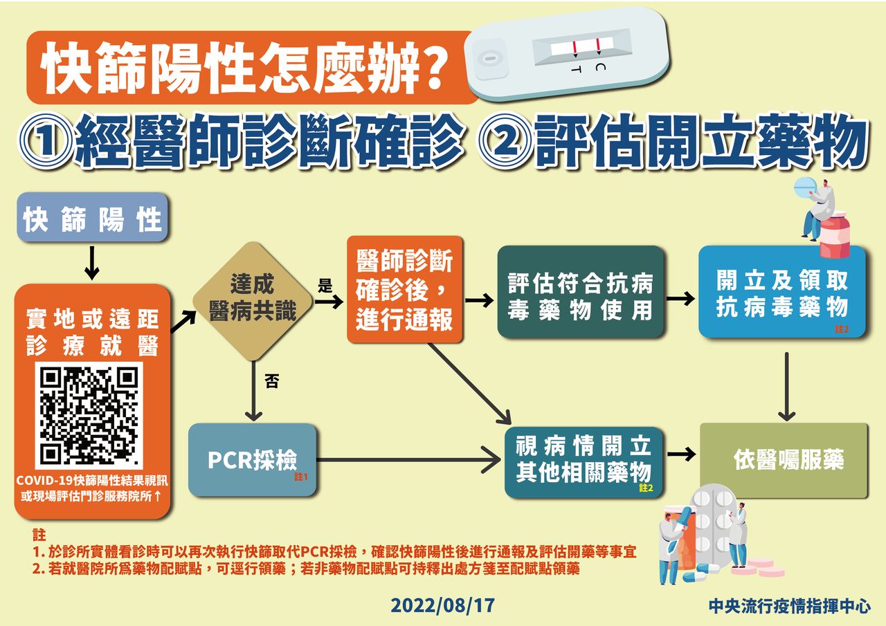 醫療應變組副組長羅一鈞表示,目前都還是用快篩陽性,經醫師診斷判定確診,只要快篩陽性。就可以到全台各縣市提供遠距或實地診療的院所,完成確診通報程序,後續就會收到自主回報疫調等。