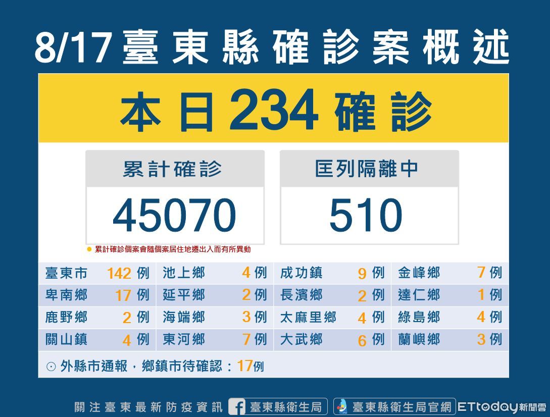 台東縣17日新增234位確診者,217名民眾戶籍或居住地分在台東、17名為外縣市醫院通報。目前台東縣累計確診個案45070人、居隔者510人。目前台東針對COVID-19確診者分流收治情況,截至8/16下午16點為止,住院收治人數為19、加強版集中檢疫所為32人、居家照護現管人數有1230人。