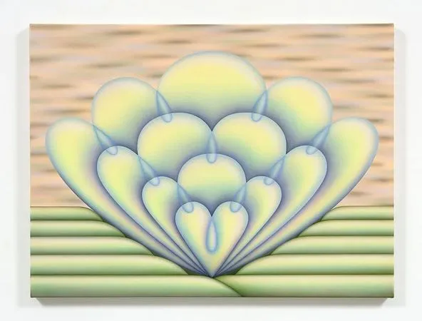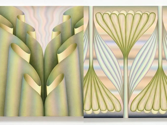 美國藝術家 Molly Greene 在新作中,使用噴槍和丙烯繪製出藍、綠、金三色的奇異植物,並用珍珠白和粉色作為點綴。這些由簡單「枝葉」交織而成的令人著迷的形象,常能給觀眾熟悉又陌生的感受。作品柔美、詩意,給人一種充滿神秘意味的女性之美。