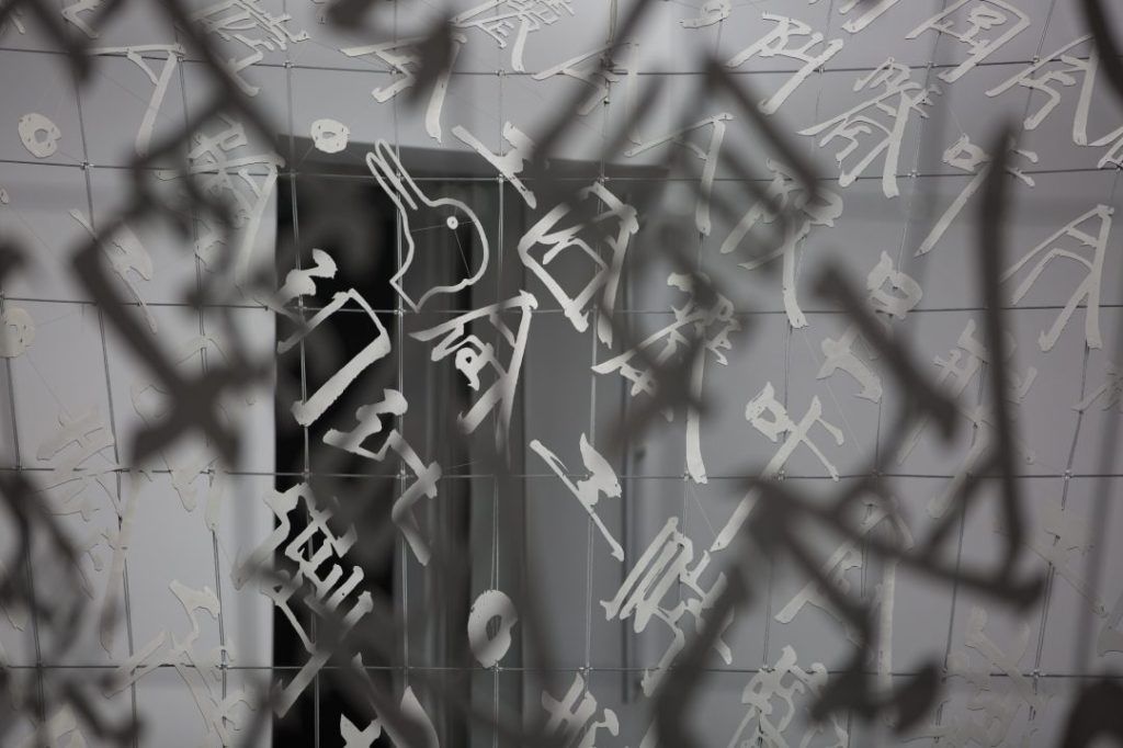 整個裝置如同巨大的「視錯覺」模型。在美術館三樓與四樓之間,原本屬於平面的一篇文本,在空間中被拉伸至地面,觸及地下一樓展廳底部的巨大鏡面上,彷彿穿透至鏡像空間。