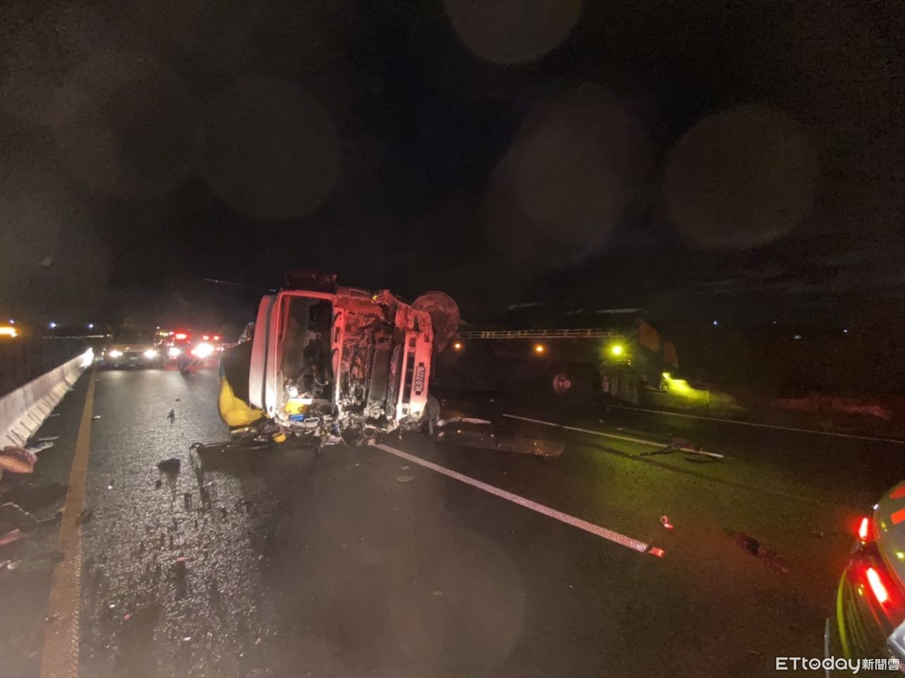 國道一號北上286.3公里18日凌晨4時許發生一起嚴重車禍!一輛貨櫃車及聯結車發生追撞,猛烈撞擊力道導致車輛翻覆,整輛車幾乎爛毀,甚至連車輪都斷裂滾至路邊。事故造成2人受傷,另有一人當場沒了生命跡象,警消獲報到場,緊急將3人送醫搶救,仍有一人不幸傷重不治,至於詳細事故原因仍待調查釐清。