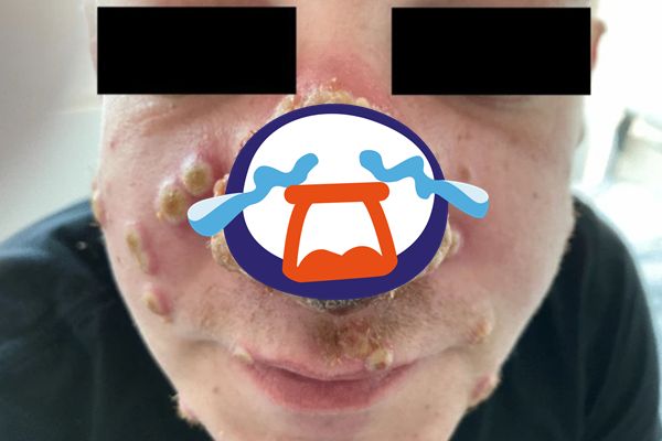 患者初次看診時,被誤診為曬傷,未料鼻子迅速腐爛,留下大量膿液及死皮,還有劇痛腫脹的傷口結痂,尤其陰莖和嘴巴周圍的膿皰更是嚴重。