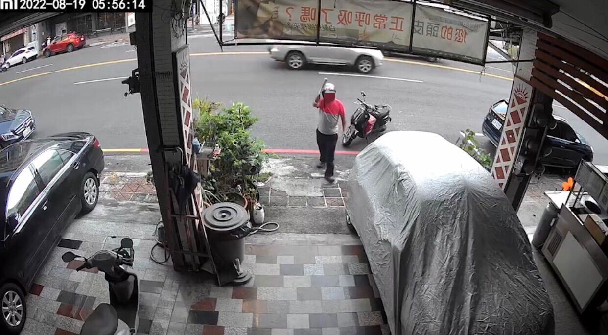 不料,今日劉男竟再度重返店家,這次還囂張對著監視器揮手打招呼,接著拿出棍棒再度朝著停放騎樓車子猛砸,敲壞車子兩側後視鏡,一度作勢離開,但又馬上回來第二度狂敲車輛。後續劉男騎車離開沒多久,疑似不甘心,三度重返,並拿著噴漆對著車輛猛噴。