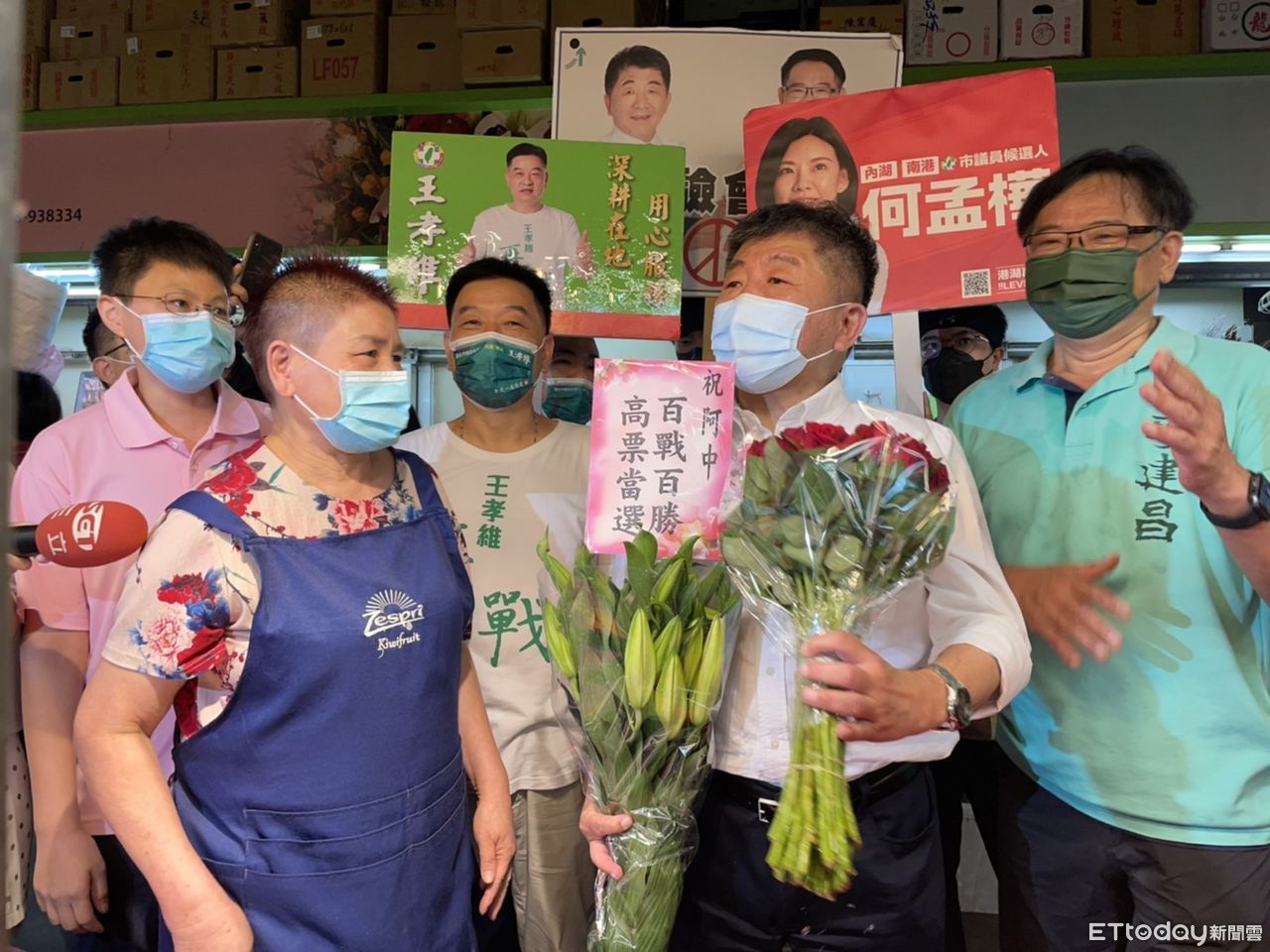 民進黨台北市長參選人陳時中20日上午走訪內湖花市拜票,會前接受聯訪時媒體問,是否會買花送太太?陳笑說,這是很好的建議,隨後在逛花市途中,也買了一束玫瑰花,直說要回家送給太太。有趣的是,陳時中接受導覽途中受到支持者熱烈歡迎、爭相合照,還有年輕女粉絲欣喜若狂「表白」說「好喜歡你呦!」另也有攤商送上花卉,預祝陳高票當選。