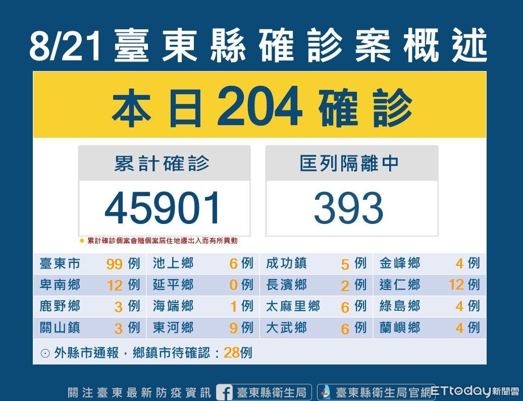 台東縣21日新增204位確診者,176名民眾戶籍或居住地分在台東、28名為外縣市醫院通報。目前台東縣累計確診個案45901人、居隔者393人。目前台東針對COVID-19 確診者分流收治情況,截至8/20下午16點為止,住院收治人數為21、加強版集中檢疫所為23人、居家照護現管人數有1316人。