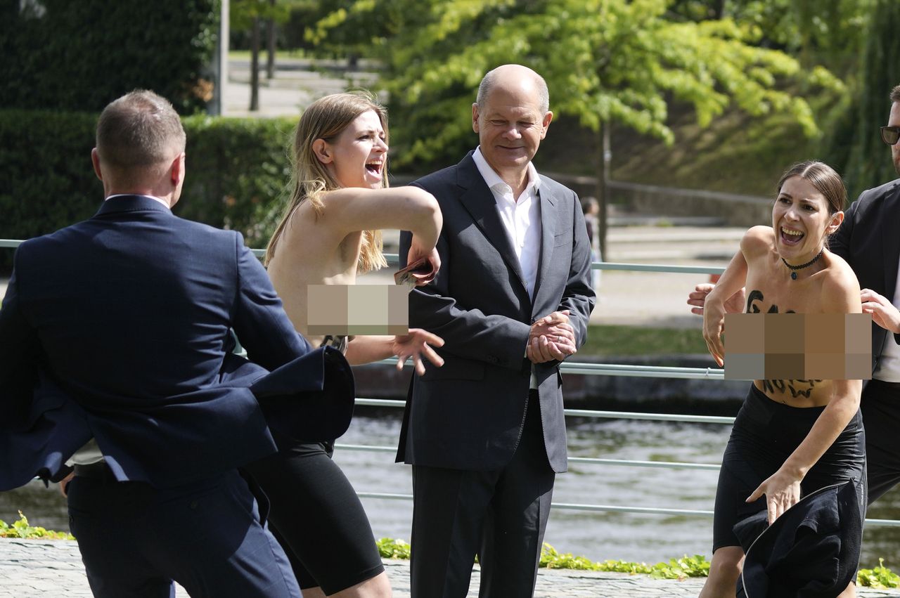 德國總理府21日開放民眾參觀,其中有2名女子假借要與總理蕭茲(Olaf Scholz)合照,待站定位後卻突然脫掉上衣,上半身全裸地露出寫在身上的抗議標語。儘管隨扈隨即衝上前去制伏兩人,但場面一度混亂,媒體更捕捉到蕭茲尷尬地微笑後,眼睛卻直盯著其中1人的胸部。