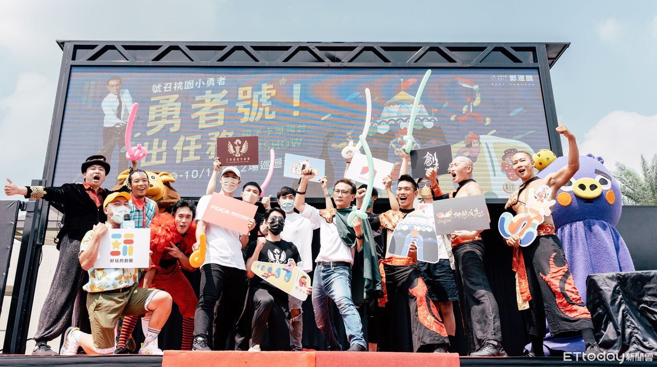 ▲民進黨桃園市長參選人鄭運鵬今(23)日在桃園區青溪公園舉辦「勇者號,出任務!」,與所有表演者大合照。(圖/記者沈繼昌翻攝)