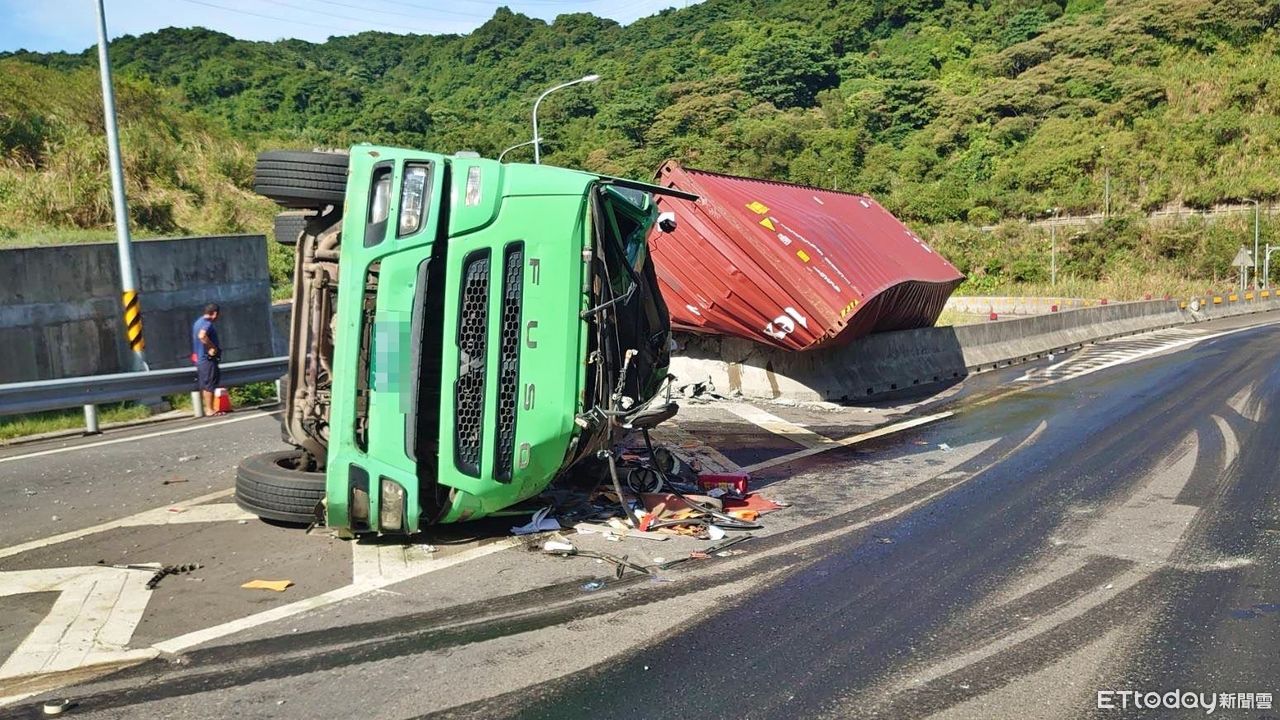 新北市瑞芳區楓子瀨路往台62線快速道路方向, 今(23日)下午2時許發生一起貨櫃聯結車翻覆意外,一輛聯結車行經該路段時,疑因貨櫃未固定好,導致車輛向左側翻覆;消防局獲報後,立即派員到場搶救,所幸葉姓男駕駛(56歲)救出後,意識清楚,左手臂骨折,現已送往台北市台大醫院救治;至於詳細車禍原因,仍有待調查釐清。