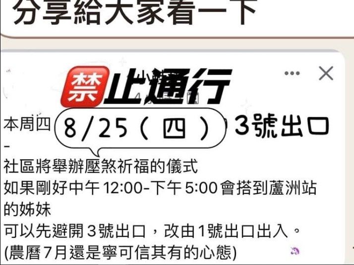 公告上提到,社區將舉辦壓煞祈福儀式,星期四下午盡量不要到蘆洲捷運總站,並叮囑「如果剛好中午12時到下午5時會搭到蘆洲站的姊妹,可以先避開3號出口,改由1號出口出入,農曆七月還是寧可信其有的心態。」