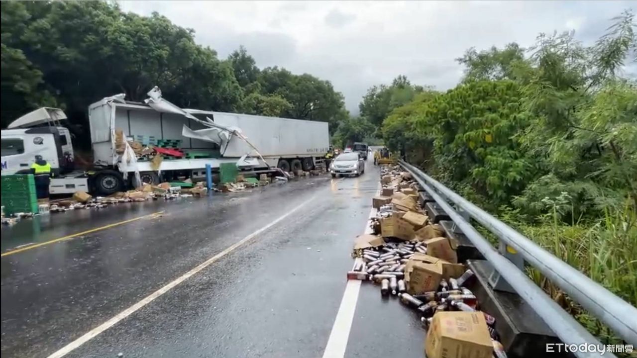 自撞的拖板車車頭整個撞擊進公路護欄和水溝中,左側車體破了個大洞,車上滿載的飲料全都掉落出來,導致雙向車道全都回堵,警消趕抵,確認司機輕傷不送醫之後,先把部分飲料移到路旁,開放單向通車。