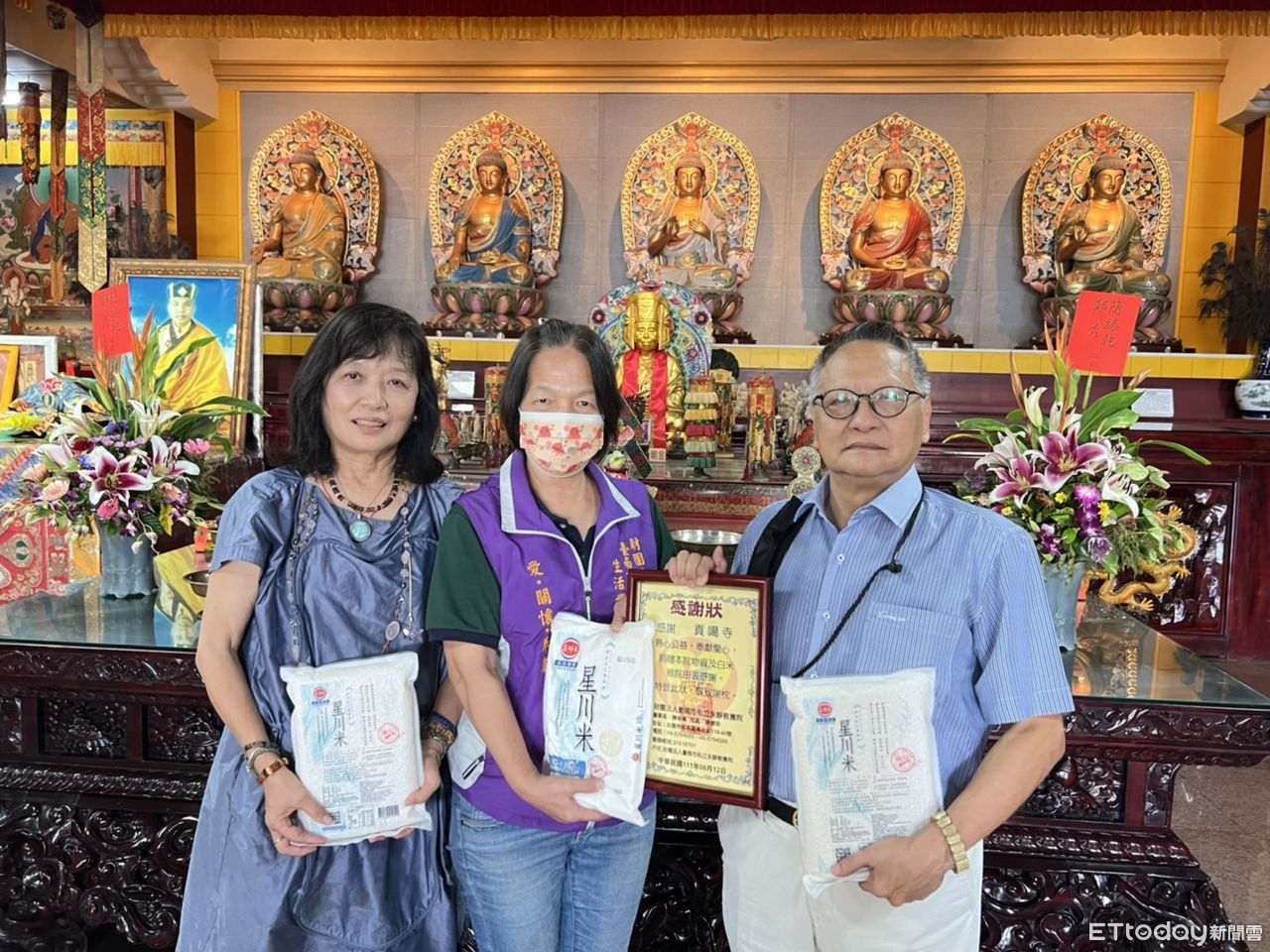 ▲貢噶寺董事長李明威(右1)與貢噶老人慈善護法會會長陳素雲(左1),代表捐贈普度物資給吾愛吾家養護中心、朝興基金會附設啟能中心等10家社福團體。(圖/記者林悅翻攝,下同)