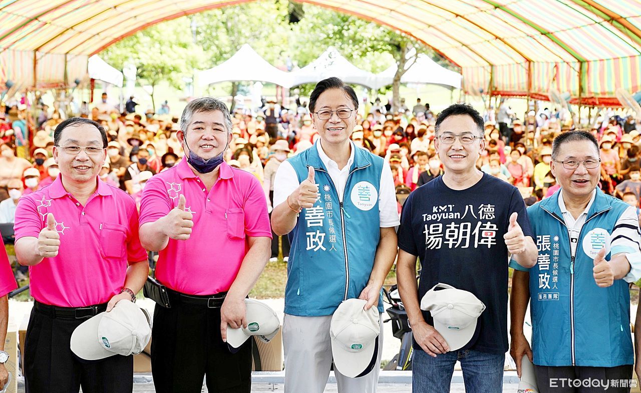 ▲國民黨桃園市參選人張善政今(27)日參訪大溪區休閒農業暨竹筍嘉年華活動,與前大溪鎮長曾榮鑑(右一)、市議員參選人楊朝偉(右二)等人對支持農民比讚。(圖/記者沈繼昌翻攝)