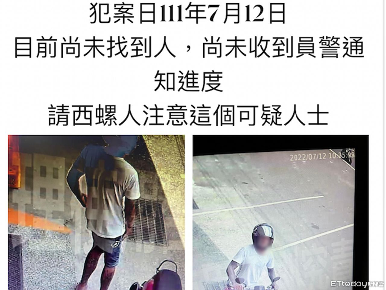 8月25日一名李姓鎮民於臉書社團《西螺人(讚)出來》貼出文章「此竊盜犯在西螺犯案,犯案日111年7月12日,目前尚未找到人,尚未收到員警通知進度,」並貼出2張竊嫌照片,呼籲西螺民眾注意小心這個可疑人士。西螺警分局埤源派出所林姓警員於貼文底下回覆「本所已積極偵辦,待犯嫌到案會移送雲林地檢署偵辦」。