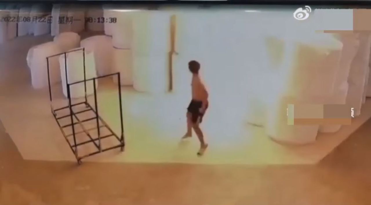 ▲珍珠棉燃燒後,男子一度試圖用手拍打滅火,但完全沒有效果。(圖/翻攝自微博)