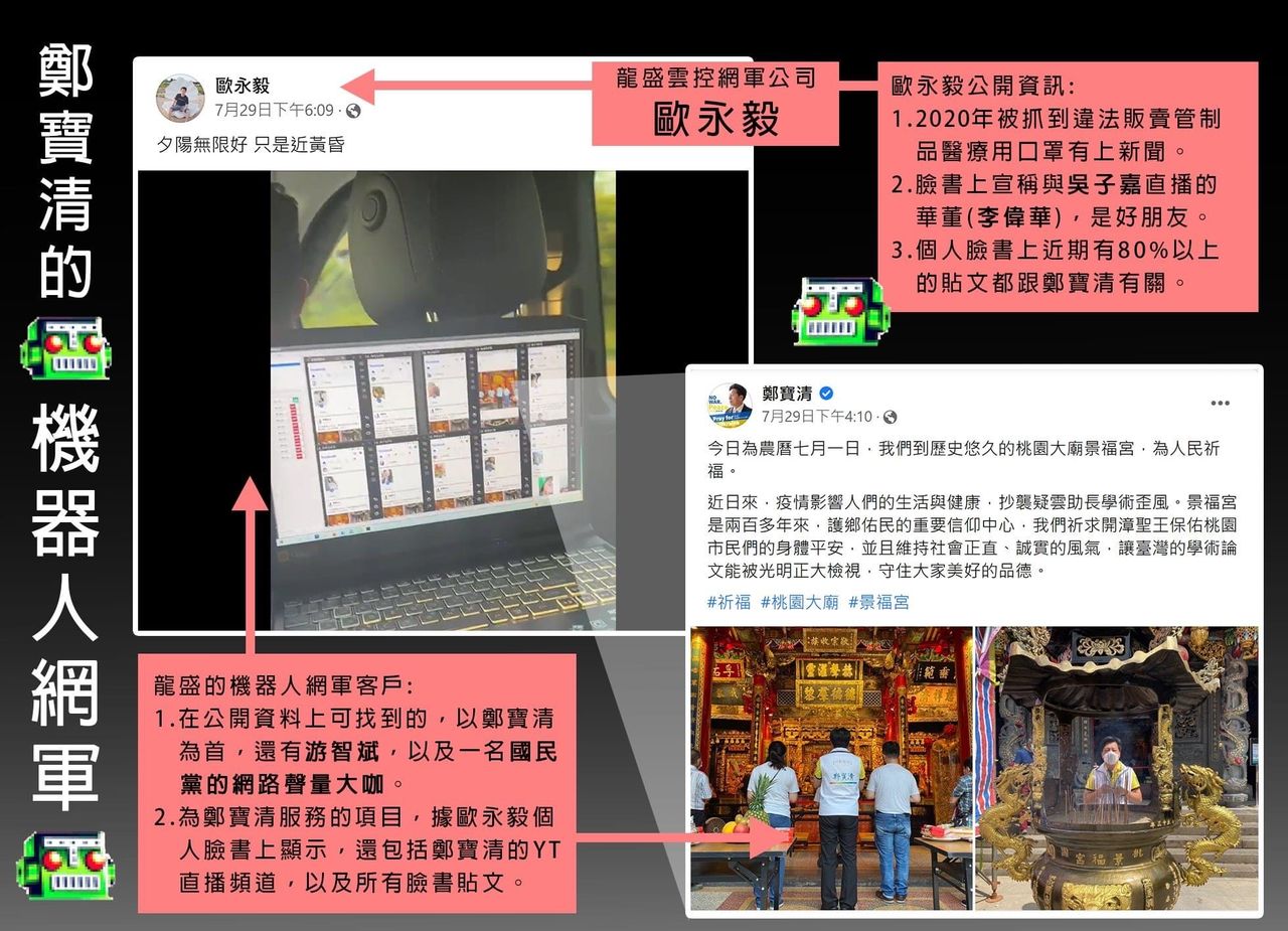 四叉貓表示,這位歐永毅在臉書上更新自己的工作進度,發現其有幕拍到筆電的幾秒鐘,那部筆電正在用假帳號程式大量幫鄭寶清的粉絲頁灌讚,還拍到幫「寶哥開槓」(鄭寶清的YT頻道)灌觀看流量的截圖與幫「游智彬:桃園阿彬哥」灌讚灌留言,「奉勸各位網軍頭子還是空軍總裁,在工作的時候不要拍影片炫耀啦!」