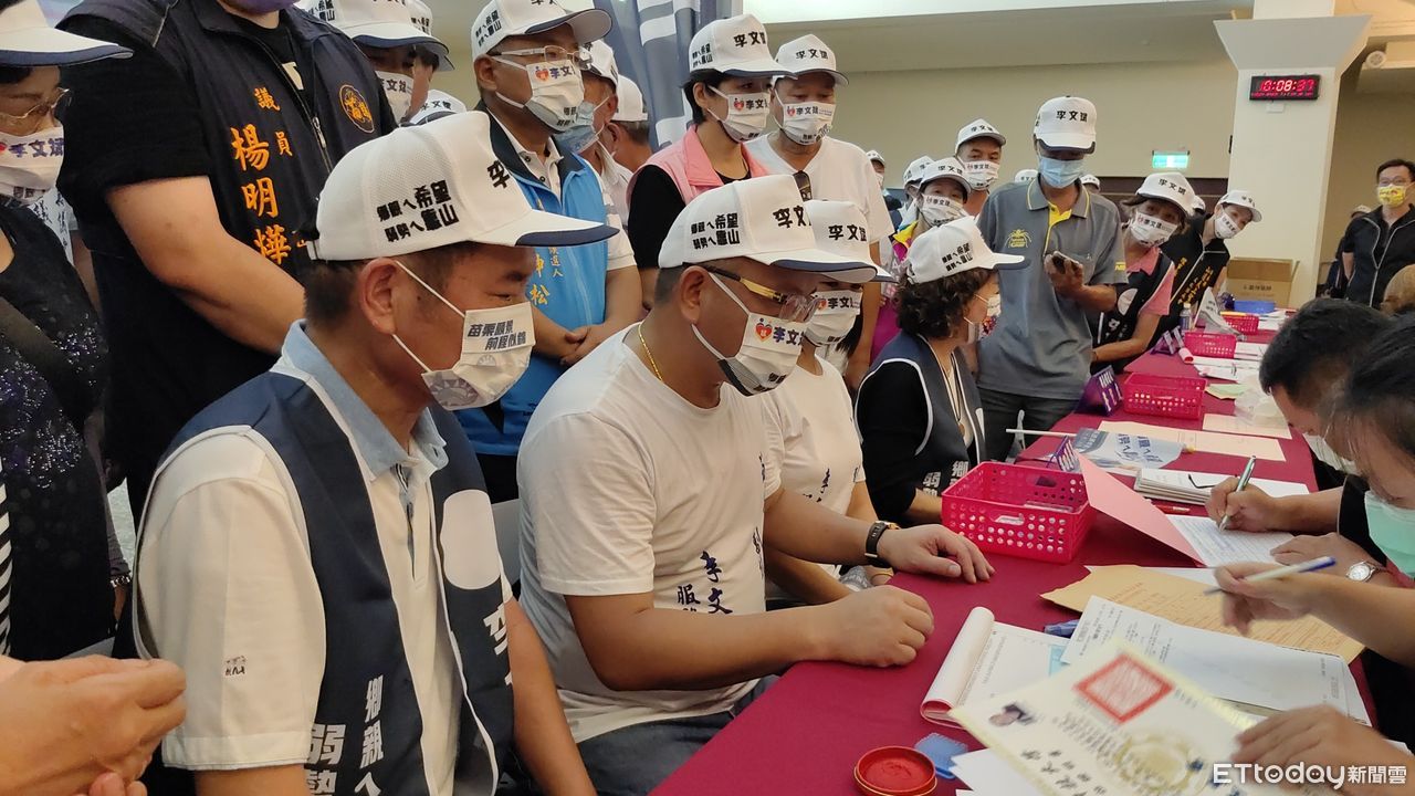 ▲鍾東錦(右2)、徐耀昌妻子蔡麗卿(左3)29日陪同苗栗縣議會副議長李文斌完成參選登記,並喊出下屆議長交棒給他。(圖/記者蔡文淵翻攝)