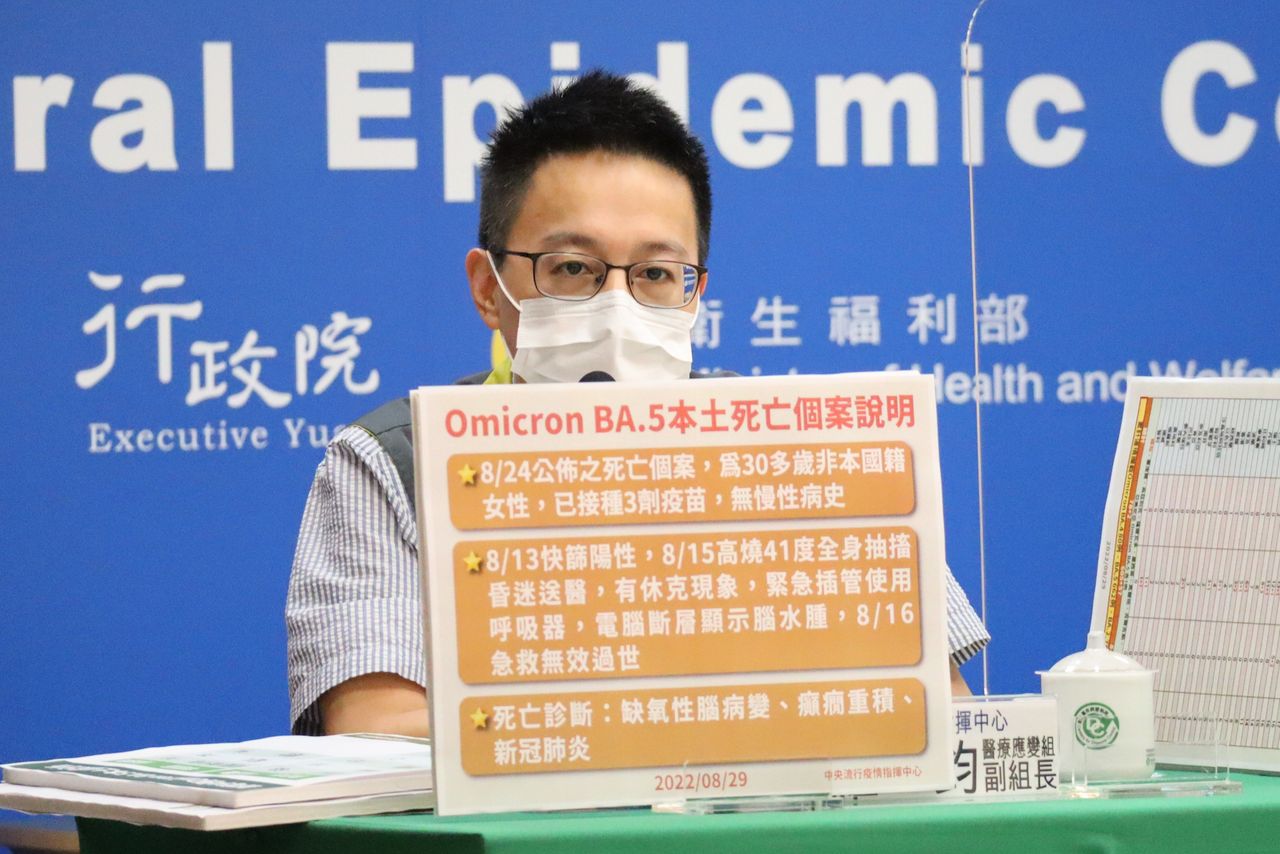 醫療應變組副組長羅一鈞表示,今日BA.5死亡個案為8/24公佈經基因定序後驗出,為30多歲非本國籍女性,接種滿3劑疫苗無慢性病史,8/13快篩陽陽性,8/15高燒到41度,全身抽搐昏迷送醫,8/16急救無效過世,死亡診斷為缺氧性腦病變、癲癇重肌與新冠肺炎。