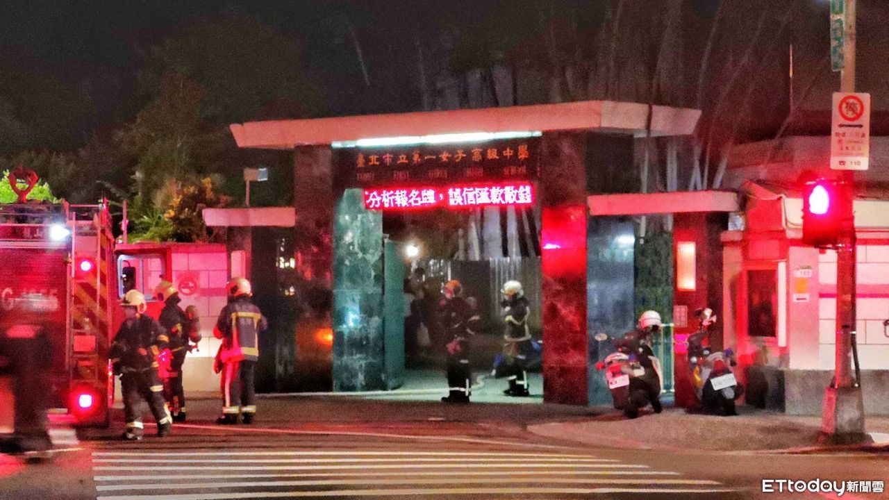 ▲北一女中晚間發生火警,消防員趕抵拉水線灌救。(圖/記者黃彥傑攝)