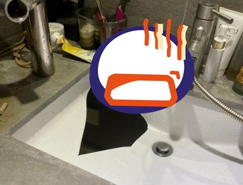 圖片中可見,原PO的洗臉檯上放了牙刷、牙膏、洗面乳等物品,而破裂處上方則有一個肥皂架,其設計為防積水架,有一個細長的洞口讓水流到排水孔。
